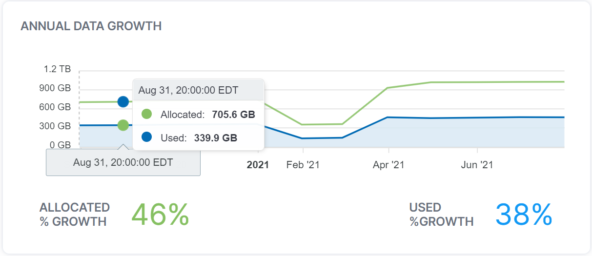 In the Properties section, locate the Annual Data Growth card. This card will show you Allocated % Growth, as well as the Used % Growth for one, some, or all instances/databases within the desired timeframe.