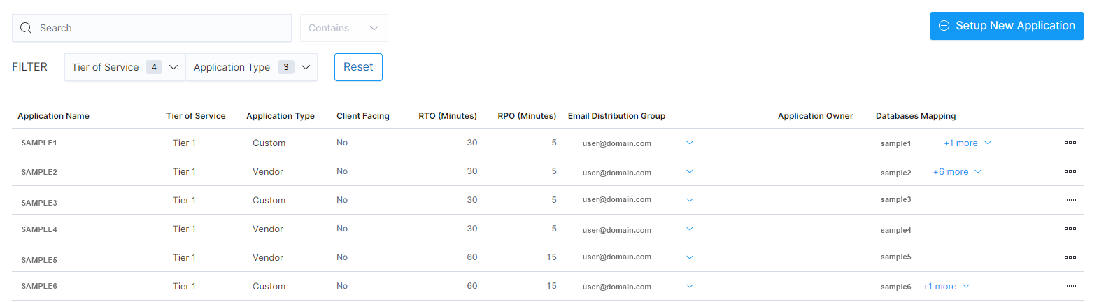Users can determine application ownership information, application type, application RTO/RPO, email distribution groups for applications, as well as the databases used by the applications.