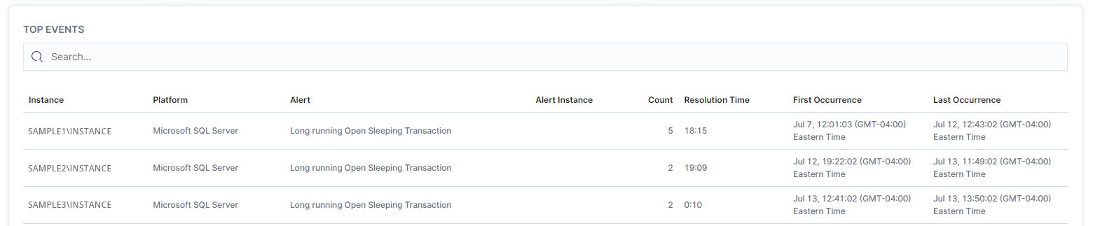 In the lower section of the Alerts - Overview page, users can determine alert locations, alert amounts, resolution times, the first occurrence and the last occurrence of the alert.