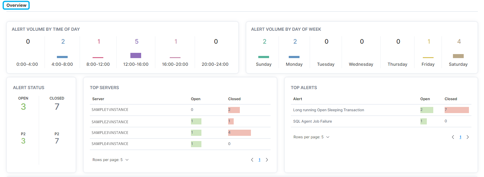 In the Overview section, users can determine alert volumes by day of the week and by time of the day, alert status, servers with alerts, and the most-generated alerts on the system.