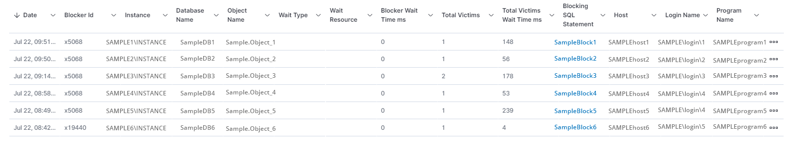 The Blocking - Details page displays the date, identifiers such as instance, database, and object name of where the blocking occurred, wait time, wait type, blocking SQL statement, host, login name, and program name.