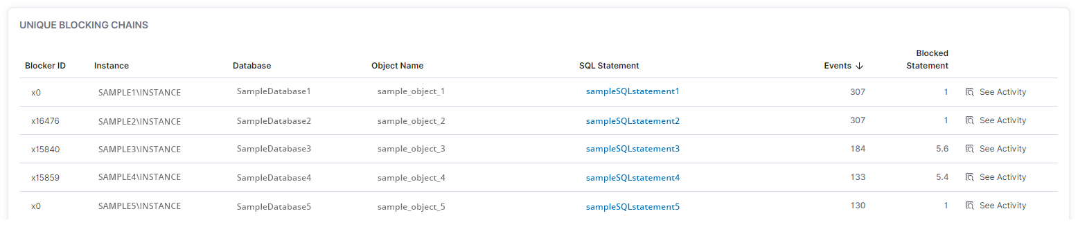 On the Blocking - Overview page, users can determine when blocking is occurring, where blocking is occurring, and unique blocking chains.