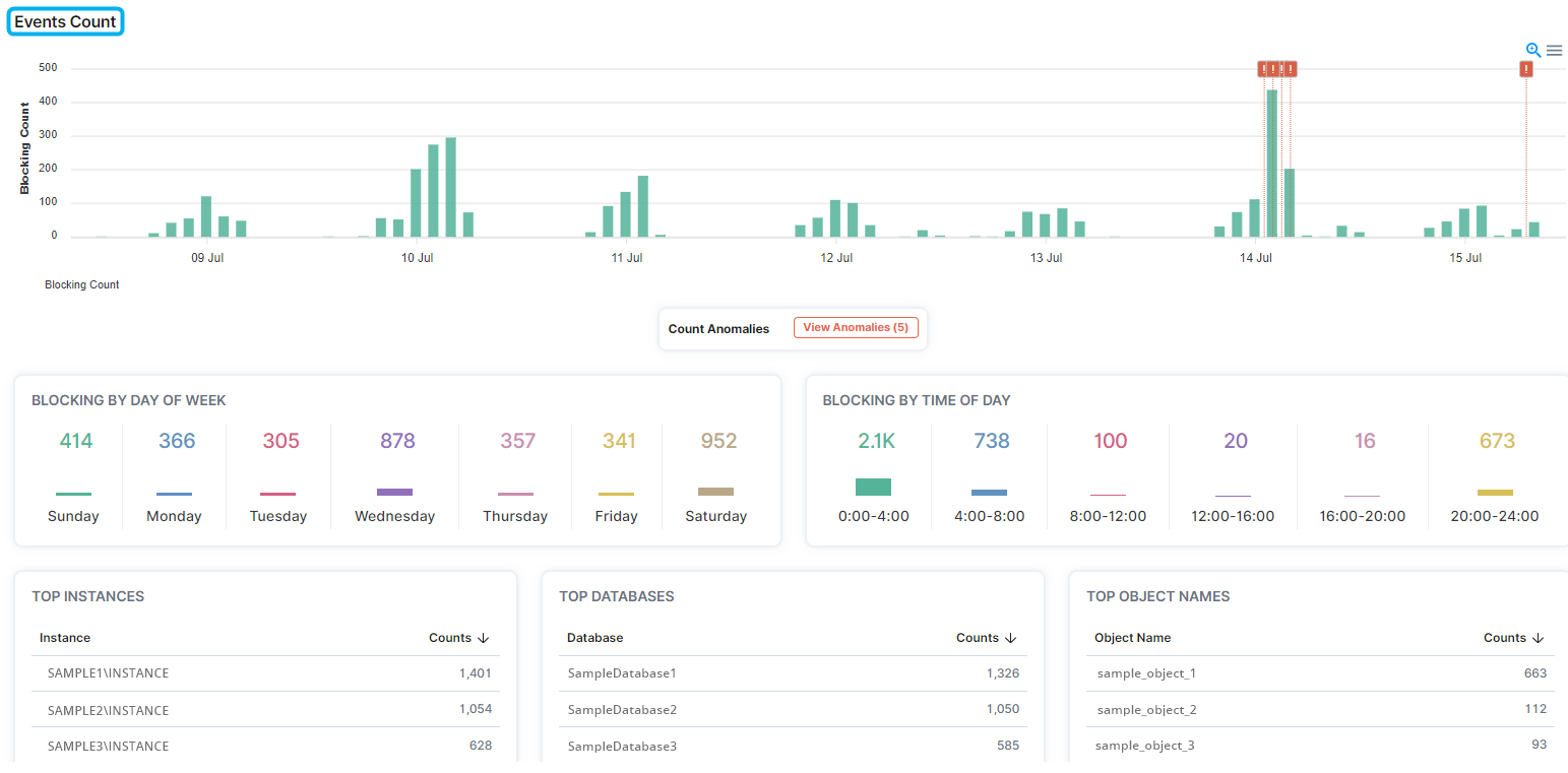 In the Events Count section, users can determine the dates, days of the week, and times of the day when blocking occurred, when anomalies of blocking occurred, and the instances, databases, and objects with the most blocking events.