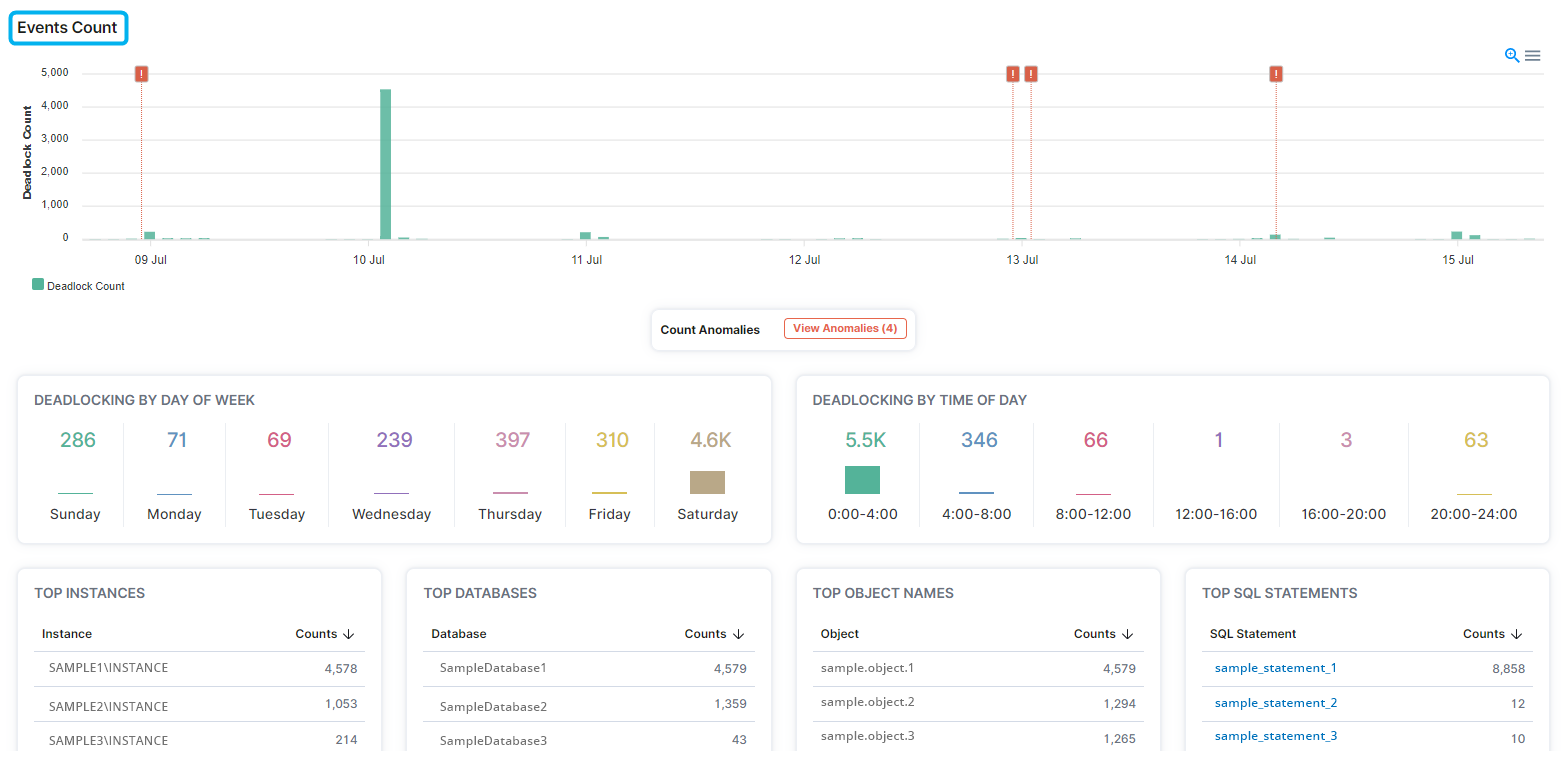 In the Events Count section, users can determine the dates, days of the week, and times of the day when deadlocking occurred, when anomalies of deadlocking occurred, and the instances, databases, objects, and SQL statements with the most deadlocking events.