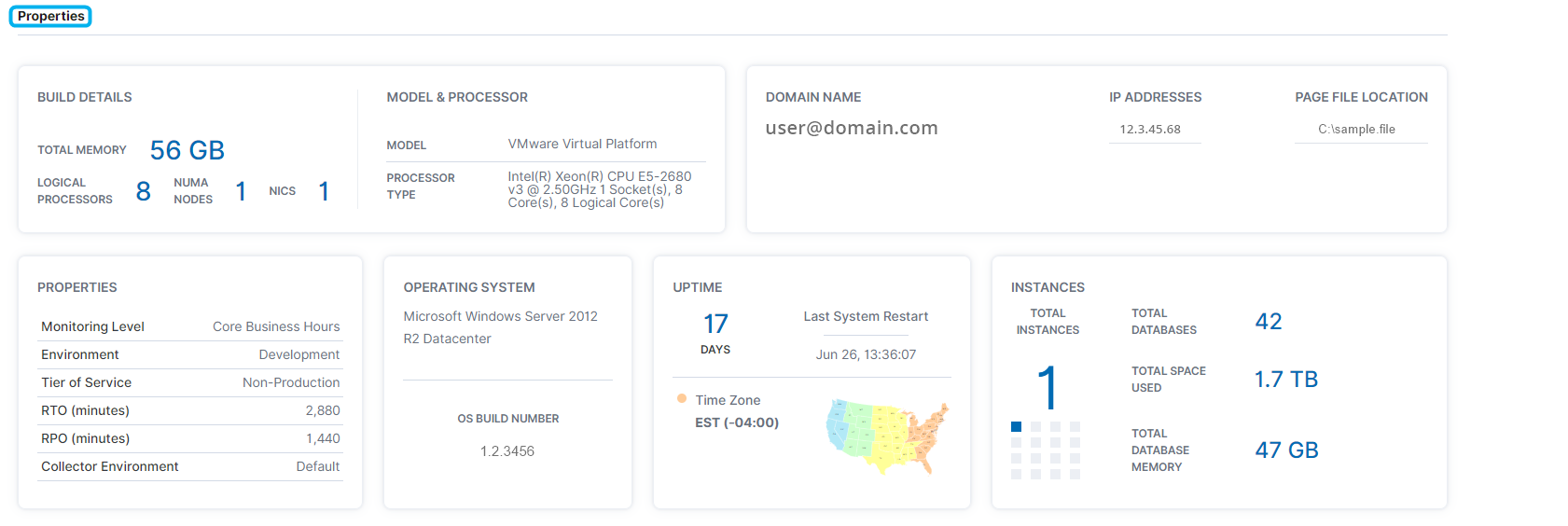 The Properties section displays build details, model and processor, domain name, IP address, page file location, properties, OS, uptime, and instance information of a host.