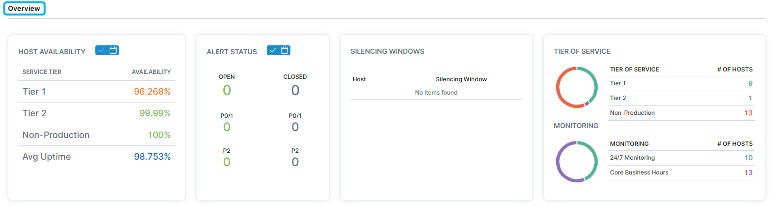 In the Overview section, users can view information on host availability, alerts, scheduled silencing windows, monitoring and tiers of service.