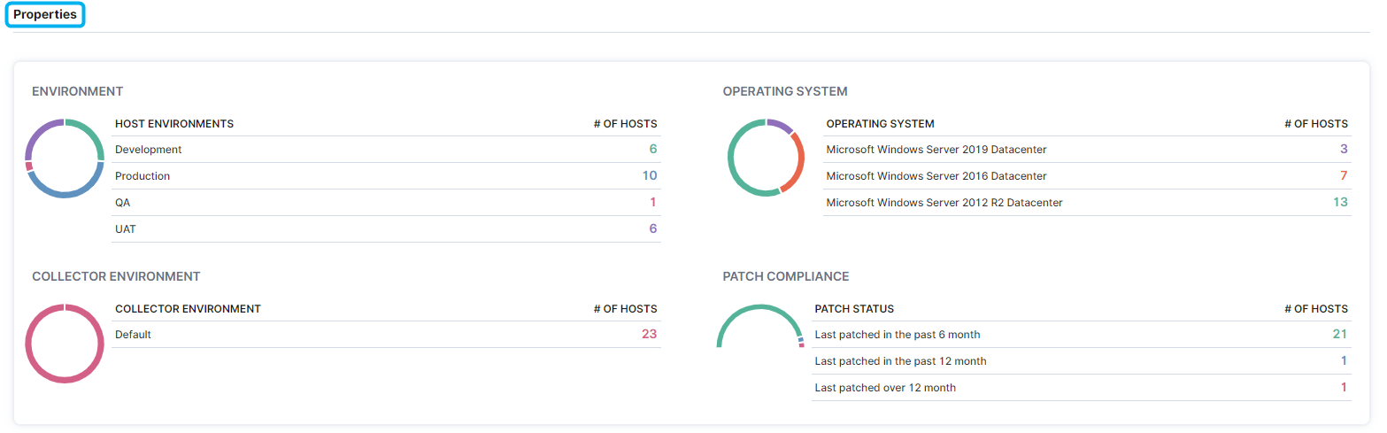 Users can determine host availability, alert statuses, silencing windows, tiers of service and monitoring, sizing recommendations, capacity and storage performance, logical CPUs, environment, OS, and patch compliance on the Hosts - Overview page.