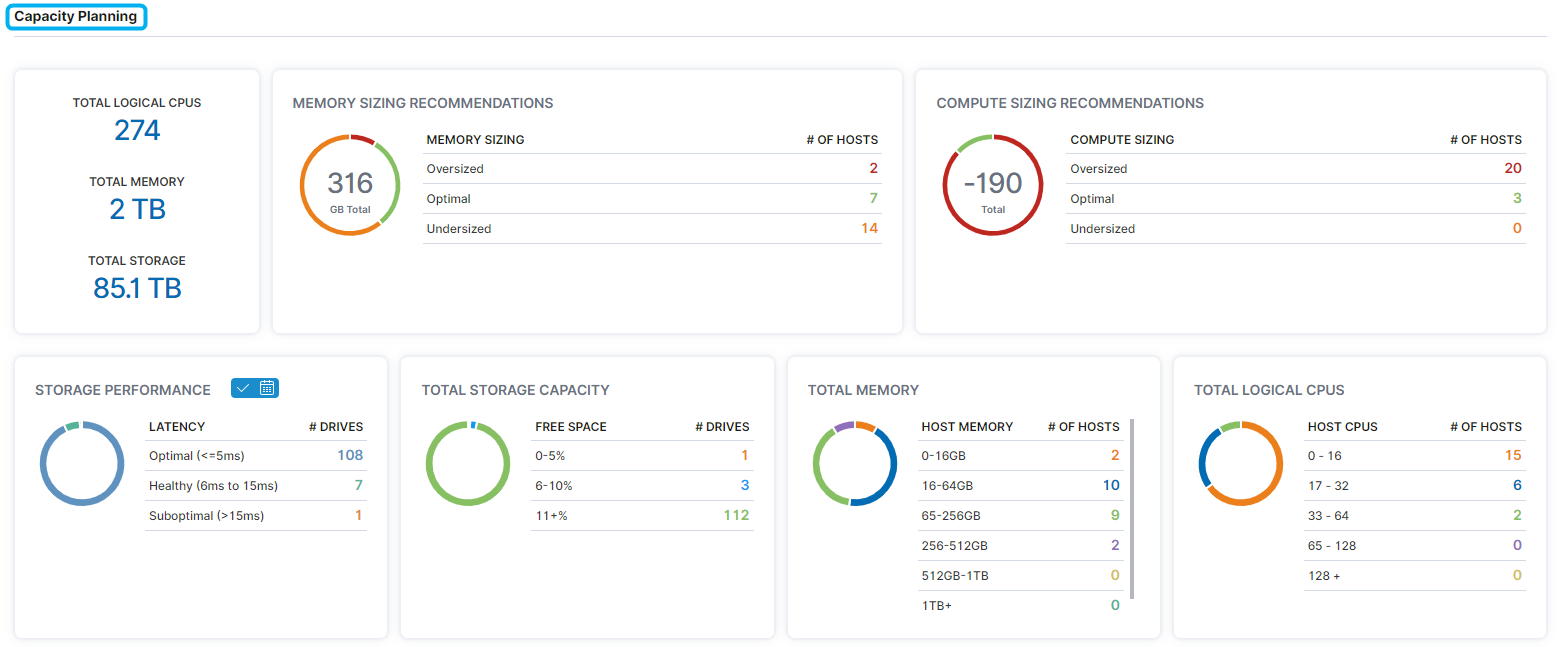The Capacity Planning section displays amounts of total host CPUs, memory and storage sizes, sizing recommendations, as well as storage and performance information.