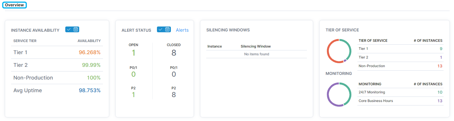 In the Overview section, users can view availability, alerts, silencing windows, tiers of service, and monitoring information across instances.