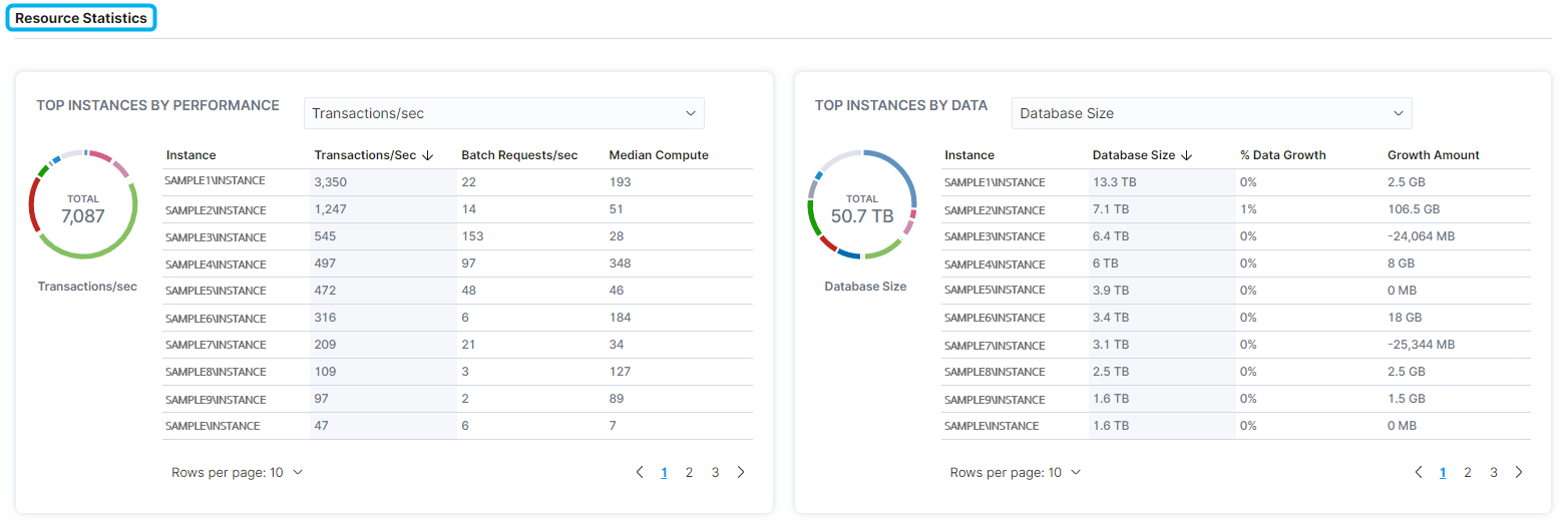 The Resource Statistics section displays top instances by performance and by data.