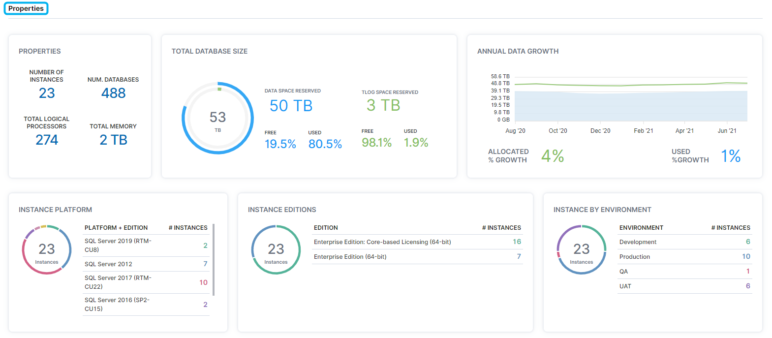 The Properties section displays instance, database, processor, and memory amounts, data space and TLOG space reserved, annual data growth, as well as instance platform, edition, and environment.