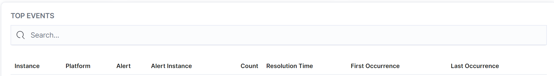 The bottom table titled Top Events will show the most frequently occurring alerts in the desired environments across your systems. Additionally, the Top Events table will display what instance and platform the alert is from, the total count, as well as resolution time, first occurrence, and last occurrence within the selected time range.